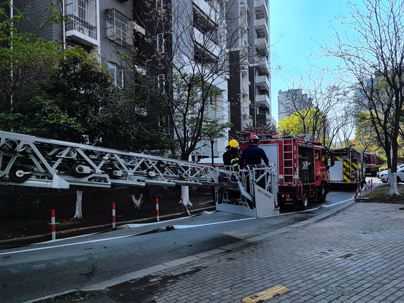 “喂喂喂,是119嗎?我們小區(qū)著火啦!我在崇川區(qū)園林路惠澤苑小區(qū)21棟1單元,是樓上丟的煙頭點燃樓道內(nèi)雜物,有大量濃煙冒出,你們快來!”演練中,物業(yè)工作人員發(fā)現(xiàn)著火點后立即展開行動。通知微型消防站人員第一時間上樓展開先期疏散救援工作。小區(qū)消防控制室啟動應(yīng)急聯(lián)動預(yù)案,開啟消防水泵,打開樓層應(yīng)急廣播。物業(yè)負責(zé)人指導(dǎo)住戶逃生,引導(dǎo)疏散。