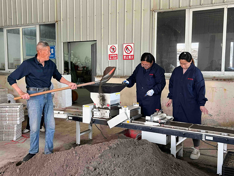 在播種工作車間外的一座座“黑土山”引起了記者的注意。原來,在育秧流水線上不斷放入的“黑土”,是充滿了秧苗所需營養(yǎng)成分的育秧營養(yǎng)土,“一般一袋50升的基質(zhì)配100斤無噴灑農(nóng)藥的土一起混合而成?!毖亟髟耘鄬W(xué)科團(tuán)隊(duì)副研究員薛亞光介紹,和過去育秧需要大規(guī)模取土相比,目前使用的基質(zhì)混合土更具“性價(jià)比”:不僅可以減少取土量,解決土壤培肥均勻難的問題,還可以通過提前科學(xué)配比好的基質(zhì),為秧苗源源不斷地注入營養(yǎng)成分,極大縮短了育秧周期。