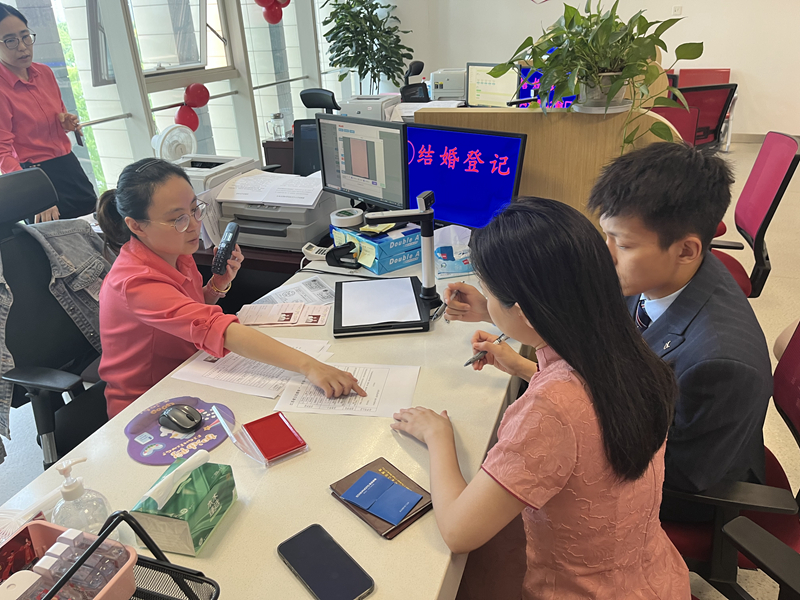 發(fā)布時(shí)間:2024-05-21 編輯:王婷 來(lái)源:視覺(jué)南通網(wǎng)“520”因諧音“我愛(ài)你”,成為許多準(zhǔn)新人青睞的結(jié)婚登記的甜蜜日子。20日當(dāng)天,南通開(kāi)發(fā)區(qū)婚姻登記處、團(tuán)工委、婦保計(jì)生中心三家單位攜手,舉辦集體頒證、新婚課堂、婚檢知識(shí)宣講面對(duì)面等“520”系列活動(dòng),為前來(lái)領(lǐng)證的新人送上“新婚賀禮”。