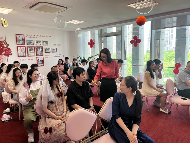 張靈鈴和陸楨鋒是一對“95后”情侶,作為小學(xué)同學(xué)的他們?nèi)缃裨倮m(xù)前緣,在戀愛一年多時間后決定步入婚姻的殿堂?!拔覀兒茉缇驮诰W(wǎng)上提前預(yù)約了,專門挑選‘520’這個浪漫的日子來領(lǐng)證,對我們而言非常有意義。今天的活動儀式感滿滿,今后我們也會承擔(dān)起家庭的責(zé)任,并肩走向未來的美滿人生?!睆堨`鈴笑著說道。