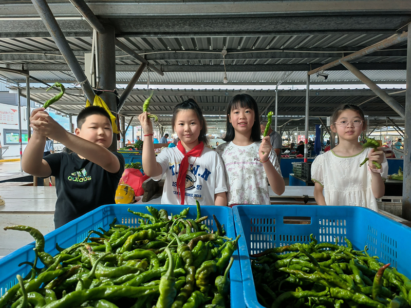 同學們頭一回走進農(nóng)貿(mào)市場的攤位推銷自己種植的太空蔬菜,怎么才能吸引家庭主婦們的眼球?304班朱鑫淼、402班耿宇辰、501班顧陸堯等13名同學,各自拿出看家本領(lǐng)吆喝開了,主打的是自己種的太空蔬菜,不施化肥、不打農(nóng)藥?!白哌^路過千萬不要錯過,我們自己種植的太空杭椒大甩賣啦!”304班學生朱鑫淼看到市民走進菜場,放聲吆喝。