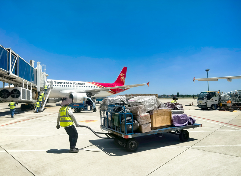 7月30日,工作人員在南通興東機(jī)場(chǎng)忙碌運(yùn)送旅客行李和貨物。截至7月30日,南通興東機(jī)場(chǎng)當(dāng)月運(yùn)輸旅客38.98萬人次,同比增長2.7%。預(yù)計(jì)7月份,機(jī)場(chǎng)旅客吞吐量將突破40萬人次。