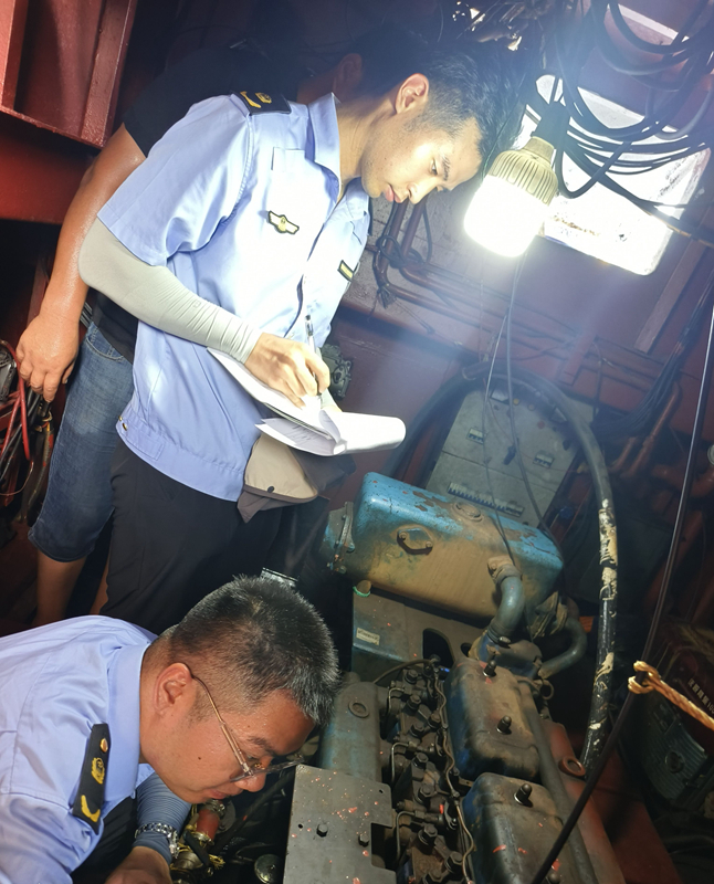 發(fā)布時(shí)間:2024-08-06 編輯:王婷 來(lái)源:機(jī)艙是漁船的“心臟”,需要格外仔細(xì)地檢查。沿著狹窄且?guī)缀醮怪钡臉翘荩浾唠S陳宇來(lái)進(jìn)入到機(jī)艙,一股悶熱夾雜著柴油味的氣體撲面而來(lái),熏得人睜不開(kāi)眼,呼吸都不順暢。機(jī)艙內(nèi)光線(xiàn)昏暗,陳宇來(lái)拿著手電筒細(xì)細(xì)查看發(fā)動(dòng)機(jī)狀況、主機(jī)是否私自更換、動(dòng)力泵是否老化、電路是否凌亂等。沒(méi)幾分鐘,陳宇來(lái)便滿(mǎn)頭大汗,身上淺藍(lán)色的執(zhí)法工作服早已被汗水浸成“深藍(lán)”,如同水洗過(guò)一般?!耙凰掖蟾乓獧z查十幾個(gè)項(xiàng)目,慢的話(huà)得要半個(gè)多小時(shí)才能驗(yàn)好,一旦發(fā)現(xiàn)問(wèn)題就要通知船老大,必須整改好才能通過(guò)檢驗(yàn)。這艘船沒(méi)啥問(wèn)題,我們?nèi)ハ乱凰野?。”說(shuō)完,陳宇來(lái)猛灌一口水,馬不停蹄前往下一艘待檢漁船。