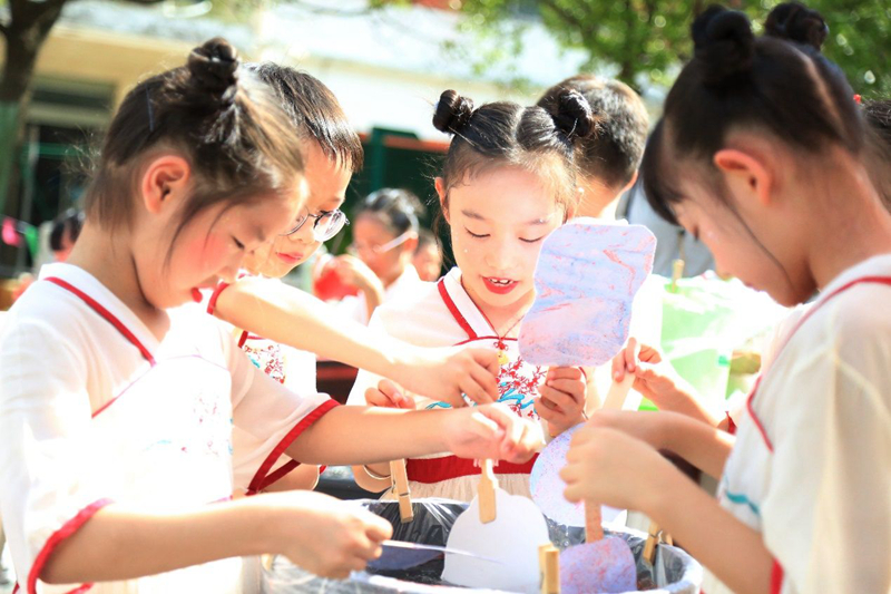 發(fā)布時(shí)間:2024-09-14 編輯:王婷 來源:視覺南通網(wǎng)結(jié)合賓山小學(xué)獨(dú)特場域,游園會分為四個(gè)篇章。除飛花令外,在桂樹林中,孩子們猜燈謎、講故事?;虼┧笤跓糁i條幅間“碰碰運(yùn)氣”,或駐足在造型各異的燈籠前細(xì)細(xì)欣賞,猜中謎底的幸運(yùn)兒忙著領(lǐng)取月餅、桂花糕等獎品,和小伙伴們一同分享甜蜜。荷花池畔,孩子們繪漆扇、作書法。他們身著漢服,宛若穿越時(shí)空而來的小書生和小仕女,有的手執(zhí)彩紙,上下翻飛,活靈活現(xiàn)的圖案躍然紙上;有的調(diào)配色彩,旋轉(zhuǎn)扇面,一幅幅漆扇出水而成,千變?nèi)f化;有的氣定神閑,筆下生風(fēng),一筆一劃間盡顯漢字之美。三角楓下,孩子們更是大顯身手,一展才藝。古箏齊奏《彩云追月》、小合唱《客家細(xì)妹采茶歌》、朗誦《水調(diào)歌頭》、舞蹈《只此青綠》等節(jié)目輪番亮相,孩子們指尖跳躍、歌聲嘹亮、舞姿動人,在一顰一笑、一舉一動間讓詩意綻放校園,共話團(tuán)圓中秋。