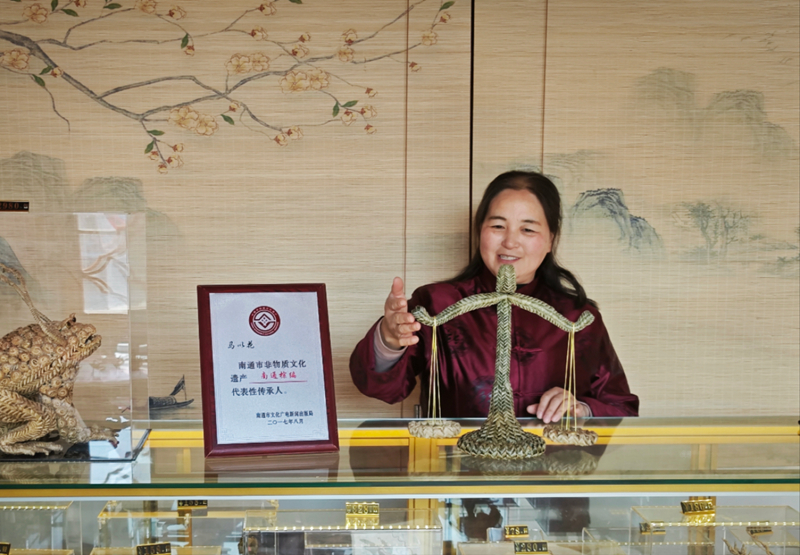 14日上午,記者走進(jìn)位于我市崇川區(qū)唐閘北市景區(qū)的“馬氏棕編非遺坊”,琳瑯滿目的棕編作品令人目不暇接;見記者對這些作品看得入神,馬以花笑著向現(xiàn)場探訪的記者介紹。