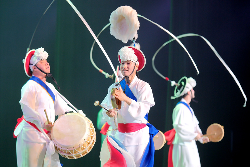現(xiàn)場,韓國國立國樂院為通城觀眾帶來原汁原味的韓國傳統(tǒng)舞蹈及樂器表演。其中,姜善泳流派太平舞以輕快又不失穩(wěn)重的舞步展現(xiàn)太平舞的獨特美感,表達(dá)對國家太平昌盛的祝福;板索里《春香歌》中的經(jīng)典曲目《愛之歌》通過高亢的嗓音和充滿張力的舞蹈動作,調(diào)動觀眾的情緒和互動性;韓國民謠《阿里郎》以時而渾厚、時而低沉、時而歡快的旋律,感染了在場的觀眾;農(nóng)樂·小鼓舞則用群舞的形式,向大家再現(xiàn)古樸雄壯、堅實有力的民俗舞蹈風(fēng)格。