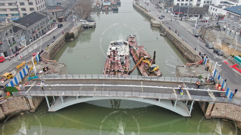 位于唐閘古鎮(zhèn)中心的唐閘大橋是連接河?xùn)|、河西的重要通道,大橋為新老兩座橋梁拼合而成,北幅橋梁建于1966年,為鋼筋混凝土雙曲拱橋。去年唐閘大橋北幅橋梁受到船只撞擊,導(dǎo)致下部兩根拱肋斷裂,經(jīng)過檢測單位深度檢測和專家評定,認(rèn)為北幅橋已超過設(shè)計使用年限,且被撞后受損,屬于危橋,存在安全隱患,決定對大橋北幅橋梁予以拆除。1月24日中午,南通發(fā)布記者航拍時看到,北幅橋梁橋面已經(jīng)拆除完畢。