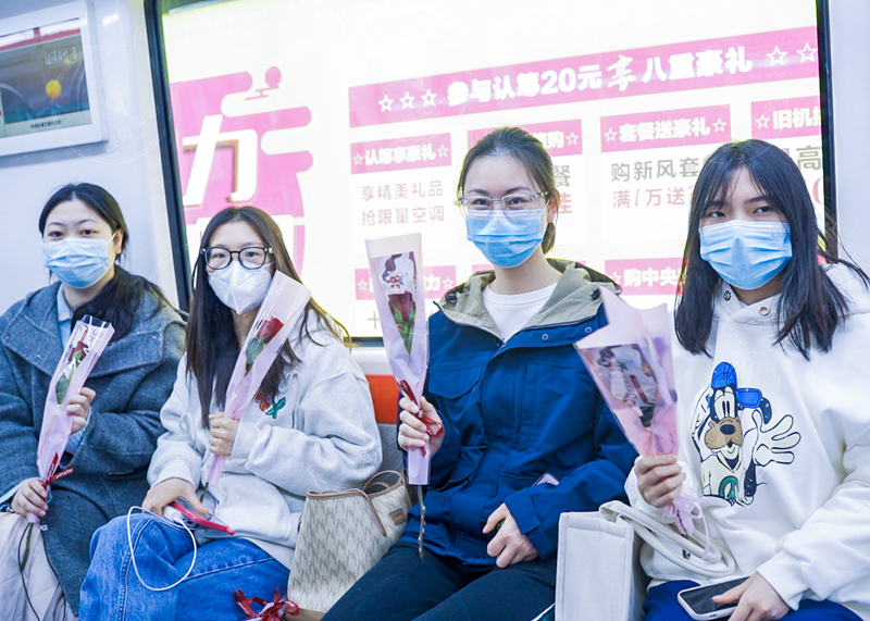 發(fā)布時間:2023-03-08 編輯:王婷 來源:視覺南通網(wǎng)早上7點(diǎn)55分,市民黃春怡登錄“南通地鐵”APP,領(lǐng)取了1張免費(fèi)乘車券,她從平潮站上車就邂逅了一場浪漫的驚喜:座位上放置著一支支鮮嫩的玫瑰,車廂海報和拉手裝飾著女神節(jié)主題,整列車廂彌漫著濃郁的節(jié)日氣息。