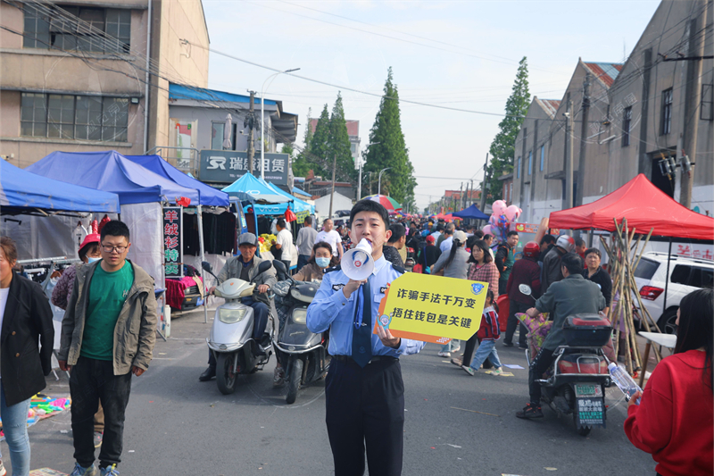 一大早,反詐民輔警支起“反詐攤位”,架起反詐宣傳易拉寶,備齊反詐手拎袋、反詐扇子等反詐禮品。針對此次廟會中老年人群較多的實(shí)際情況,民警還貼心地用普通話和方言錄制了“雙語”版反詐宣傳“小喇叭”。一聲聲反詐提醒,響徹廟會現(xiàn)場的每個(gè)角落。