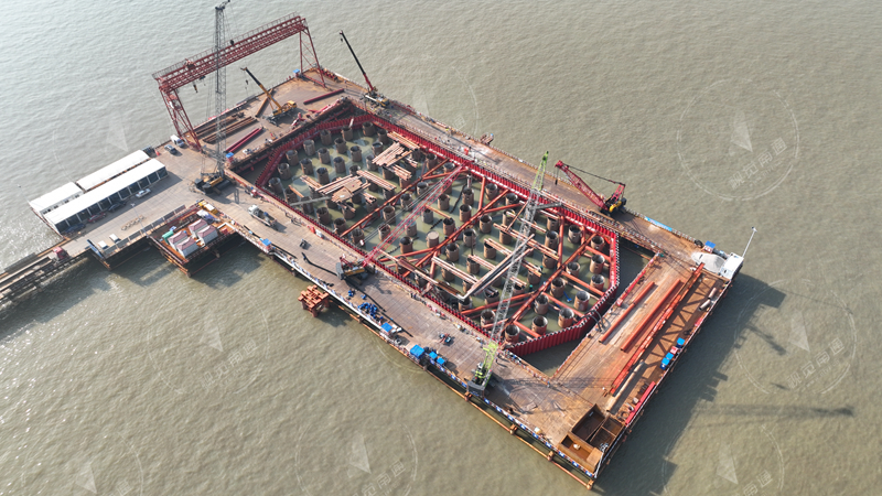 大橋南航道橋南主塔高350米,建成后世界最高懸索橋索塔,同時(shí)也是大橋南北兩座航道橋四個(gè)主塔中唯一一座水上主塔。從空中俯瞰,278根鋼管樁緊密連接,形成一個(gè)八邊形的“屏障”,筆挺拱衛(wèi)著97根橋塔樁基,如同為橋塔穿上了一件紅色“鎧甲”。南航道橋南主塔圍堰單根鎖扣鋼管樁長(zhǎng)37米,重量超過(guò)9噸,鋼管樁之間采用CT型鎖扣連接。278根鎖扣鋼管樁彼此連接構(gòu)成圍堰主體,圍堰長(zhǎng)110米,寬48米,整體呈對(duì)稱(chēng)八邊形,面積約為5000平方米,相當(dāng)于12個(gè)標(biāo)準(zhǔn)籃球場(chǎng)大小。