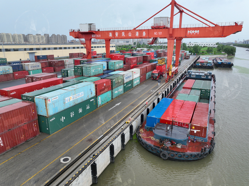 2023年7月19日拍攝的海安商貿(mào)物流園忙碌的鳳山碼頭。今年上半年,鳳山碼頭引進(jìn)大型國企中外運參與運營,采取“集散并舉”的思路拓展區(qū)域市場,集裝箱完成15000標(biāo)箱,同比增長65%。