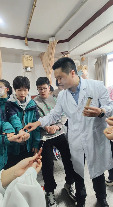 發(fā)布時(shí)間:2024-03-26 編輯:王婷 來(lái)源:視覺(jué)南通網(wǎng)“來(lái),大家跟著我一起找穴位,比如有胃痛的人,我們給他把‘內(nèi)關(guān)穴’找出來(lái)。我們可以在這個(gè)位置上扎針、艾灸?!痹诹滞坩t(yī)生的帶領(lǐng)下,“小郎中”勁頭十足,個(gè)個(gè)認(rèn)認(rèn)真真地學(xué)起來(lái),“然后我們?cè)儆锰O果或橙子做個(gè)示范,跟著我一起學(xué)‘扎針’,我們要通過(guò)拇指、食指和中指的配合……”“第一次以這樣的方式接觸針灸,感覺(jué)太神奇了,將來(lái)我也想成為一位中醫(yī)師!”一位學(xué)生說(shuō)道。