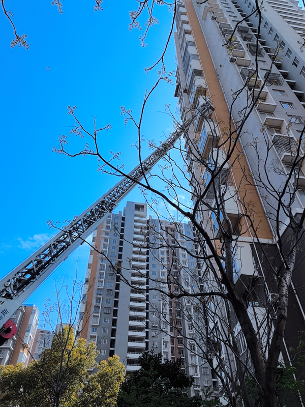 演練模擬微型消防站人員前期火災(zāi)撲救未果,且發(fā)現(xiàn)13樓有人員被困。此時消防救援人員已及時趕到,物業(yè)負(fù)責(zé)人向消防指揮員講明火災(zāi)具體位置,燃燒物質(zhì),被困人員等重要信息。消防救援人員對著火住戶房門進(jìn)行破拆,開展內(nèi)攻滅火,另一組人員架設(shè)云梯車進(jìn)行救援,成功將被困人員解救。