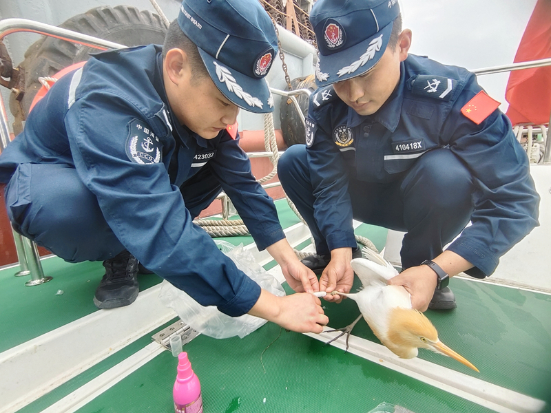 海警執(zhí)法員在小心包扎完牛背鷺傷口后,對其全身其余位置進行了檢查,確認無異常后,投喂食物及飲用水。隨后,執(zhí)法員聯(lián)系了啟東野生保護動物救助站,將牛背鷺交由救助站工作人員進行專業(yè)救治,待其完全康復(fù)后將放歸大自然。