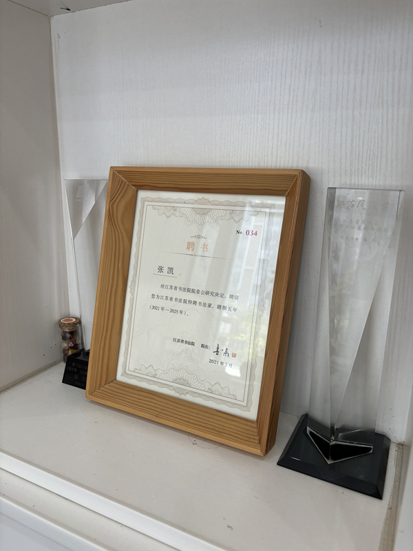 2015年,機(jī)緣巧合下,他結(jié)識(shí)了徐州市書(shū)法家協(xié)會(huì)副主席單曉光。就在他決意拜其為師時(shí),卻遭到了回絕?!暗谝谎劭吹阶髌防蠋熡X(jué)得不滿意,直到看了我寫字的狀態(tài)、對(duì)書(shū)法的執(zhí)著才慢慢同意了?!庇辛藥煾?,張凱發(fā)奮地求學(xué),觸及書(shū)法的“靈魂”?!耙彩前輲熀螅业淖植庞辛朔ǘ?,書(shū)法水平得到明顯的提升?!奔妓嚨倪M(jìn)步直接體現(xiàn)在個(gè)人榮譽(yù)墻上。