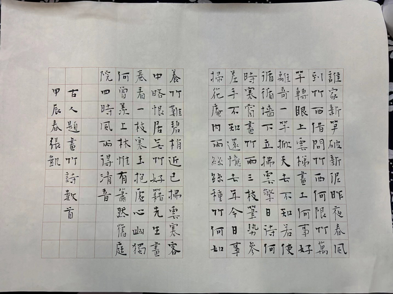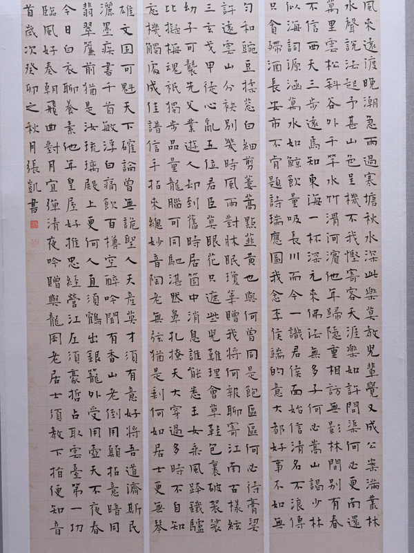 “規(guī)模大、等級(jí)高,意味著競(jìng)爭(zhēng)就大。”但面對(duì)“大考”,張凱習(xí)慣以平常心沉著應(yīng)對(duì)。他說(shuō),“寫什么內(nèi)容、選擇什么字體需要好好琢磨。到了后期創(chuàng)作,反而是最輕松、愉悅的時(shí)刻?!睋?jù)他回憶,某天晚上吃完飯回到工作室,他便執(zhí)起筆“說(shuō)寫就寫”,4個(gè)多小時(shí)全神貫注、心無(wú)旁騖、一氣呵成,完整寫就楷書(shū)千字詩(shī)文。