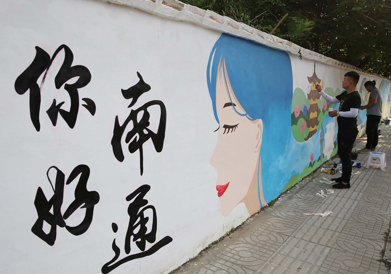 陳功是一名墻繪設(shè)計師,畢業(yè)于南通大學(xué)藝術(shù)學(xué)院。八年前,他和團隊成員發(fā)揮專業(yè)特長走上創(chuàng)業(yè)道路。他們繪制的“你好,南通”系列文化藝術(shù)墻,得到了不少單位的支持和好評。陳功和小伙伴也常為市政單位、地產(chǎn)公司等繪制壁畫。