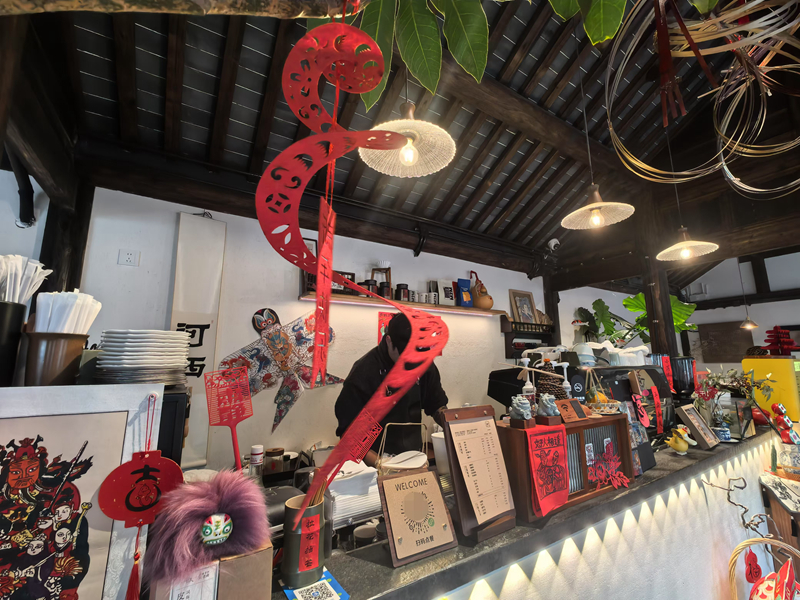 發(fā)布時間:2025-02-14 編輯:王婷 來源:視覺南通網(wǎng)“我們的愿景是以咖啡店為媒介,將南通非遺呈現(xiàn)、傳播給更多人,希望當(dāng)大家提到南通時,能有一種文化自信。”咖啡店創(chuàng)始人之一潘靜表示。出于對非遺的濃厚興趣,2023年下半年開始,創(chuàng)始團隊開始走訪海安、如皋、如東等南通各地,研究地方志、古籍等文獻資料,尋找板鷂風(fēng)箏、色織土布、通作家具等南通非遺印記。在長達近一年的非遺探尋之旅后,最終將木版年畫、藍印花布、剪紙、竹編等南通非遺技藝和元素改造設(shè)計進咖啡店中,呈現(xiàn)出“目之所及皆非遺”的美學(xué)效果。