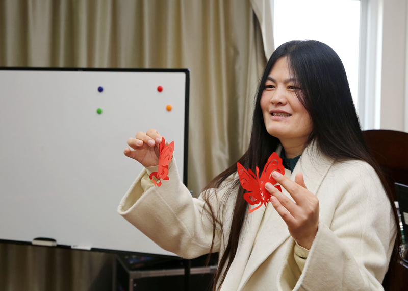 劉靜介紹非遺剪紙的起源、發(fā)展、現(xiàn)狀,展示自己創(chuàng)作的剪紙作品,講述了如何把剪紙融入教學(xué)當(dāng)中、用剪紙促進(jìn)中外文化交流的故事。她還現(xiàn)場(chǎng)示范了蝴蝶、窗花等剪紙手法,帶領(lǐng)殘疾人朋友一起學(xué)習(xí)剪紙。